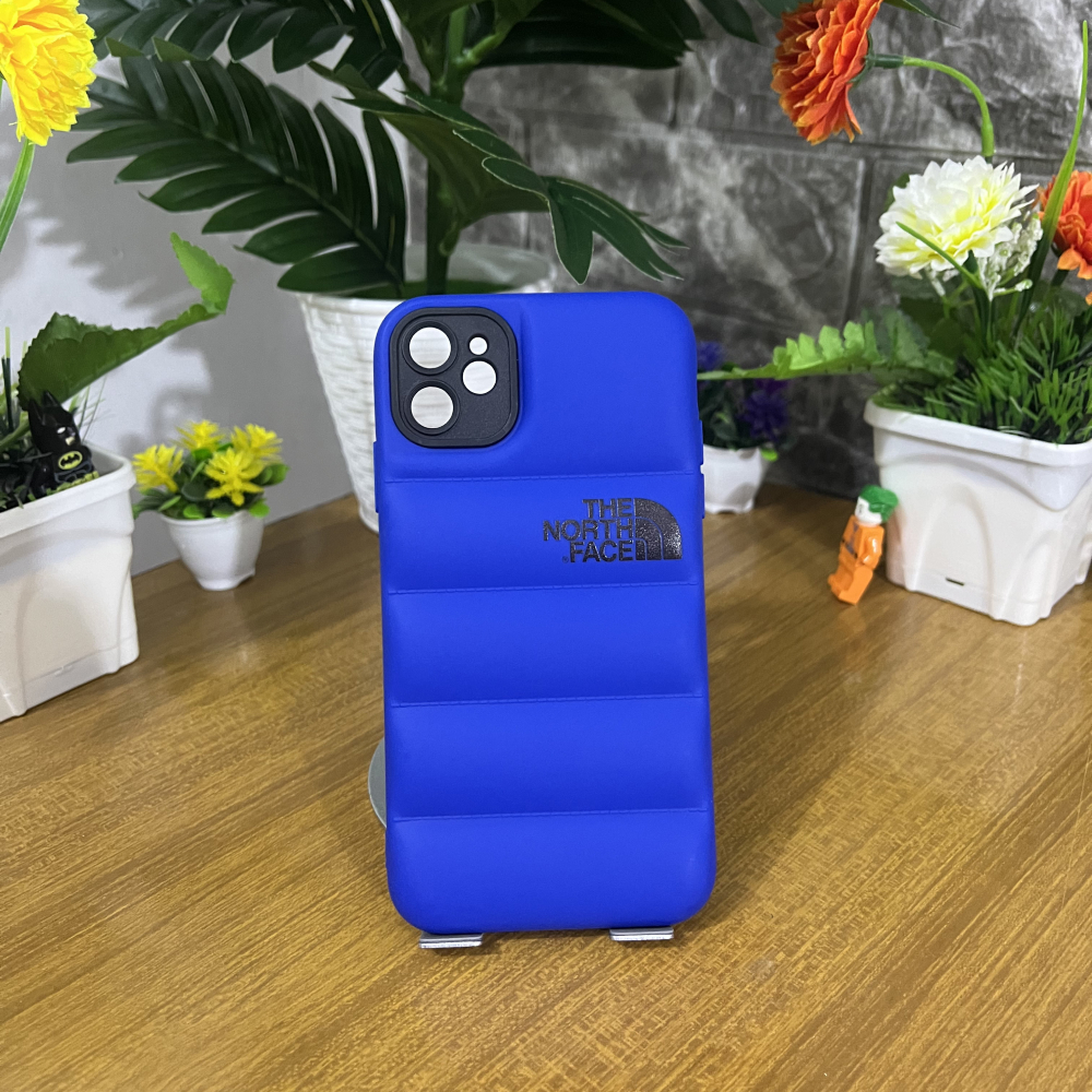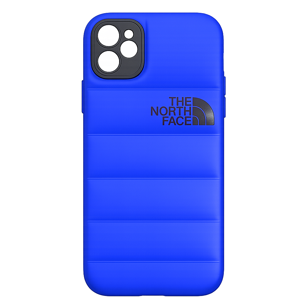 كفر مخصص لهاتف آيفون 11 بتصميم أنيق مستوحى من أسلوب The North Face، يجمع بين البساطة والفخامة مع لون أزرق جذاب ولمسة عصرية تشبه تصاميم الجواكيت الشتوية.
